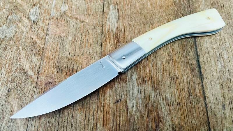 Le modèle Impromptu, couteau à cran forcé avec stop pin. Ici habillé d'un manche en dent de phacochère et de mitres en acier inoxydable. La lame de 2,5mm d'épaisseur est en acier inoxydable RWL34.