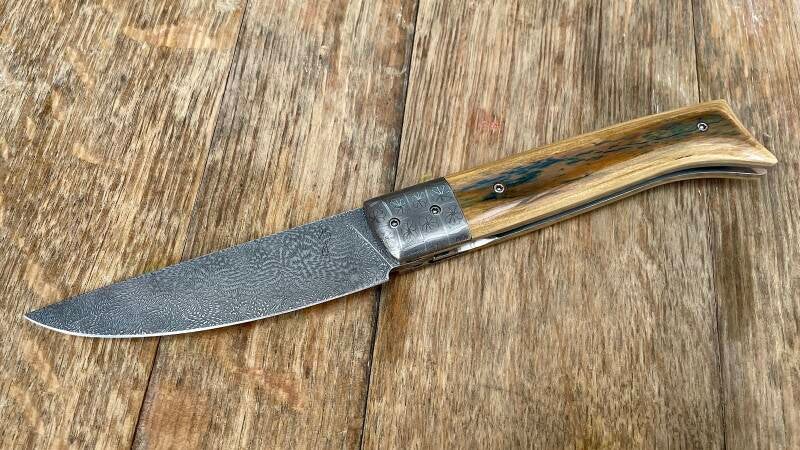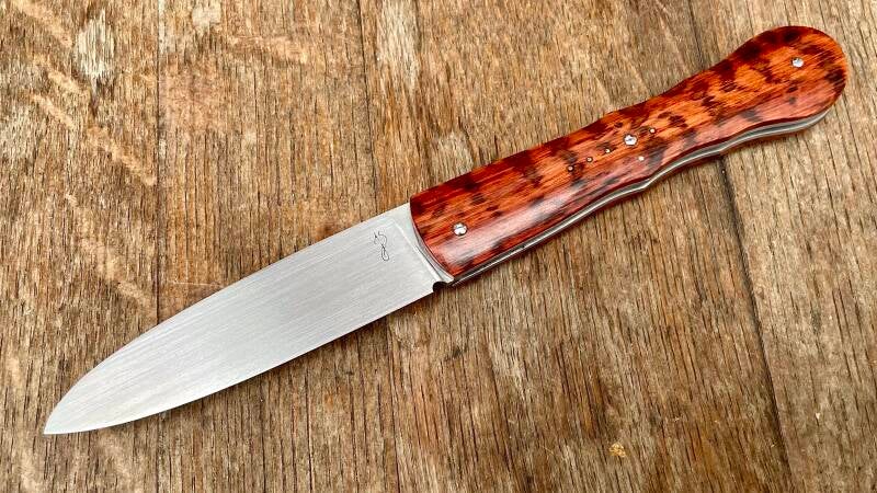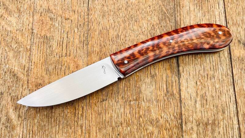 Modèle Le Violon, couteau à cran forcé avec stop pin. Ici habillé d'un manche en amourette. La lame de 2,5mm d'épaisseur est en acier inoxydable RWL34.