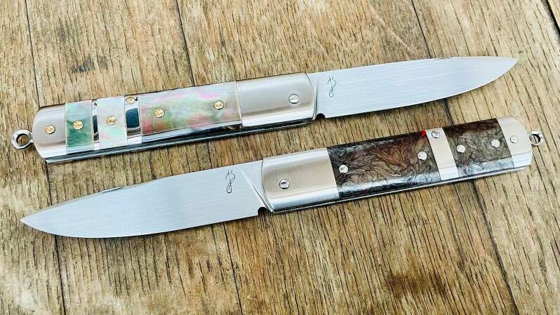 Le modèle Manon, couteau à cran forcé avec stop pin, ici avec une lame en acier inoxydable RWL34, platines/mitres monobloques fraisées et trempées, incrustés en nacre pour l'un et en carbone Dark Matter pour l'autre, bélière et onglet à la nogentaise.