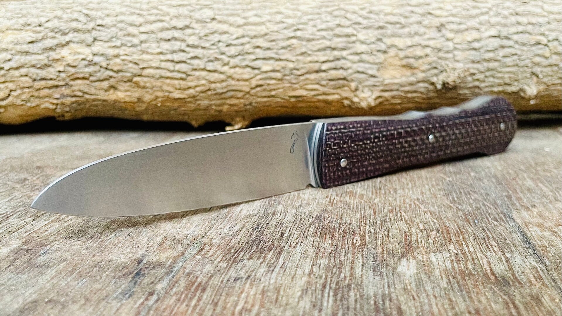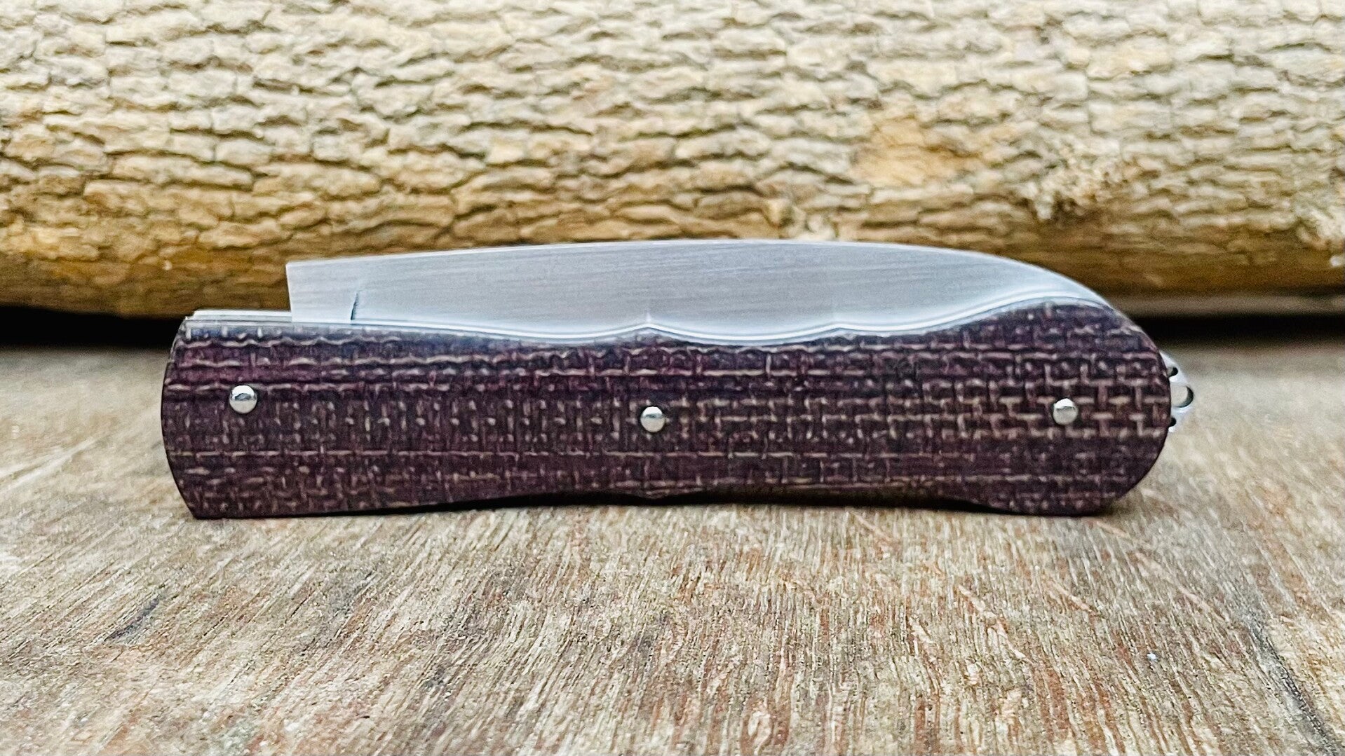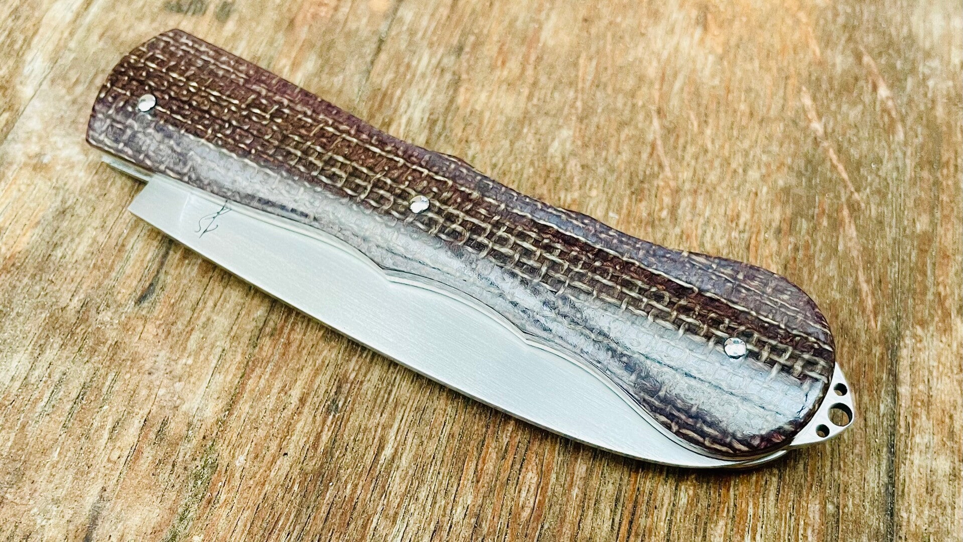Couteau à cran forcé, lame en acier inoxydable RWL34, manche en micarta toile de jute.