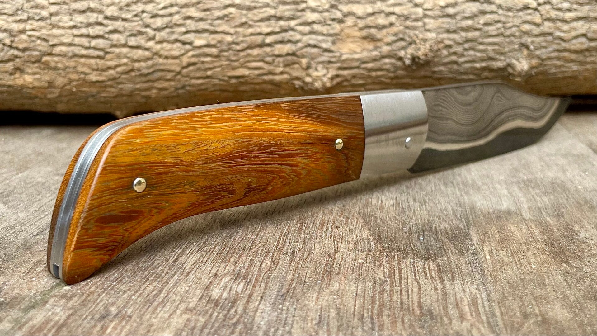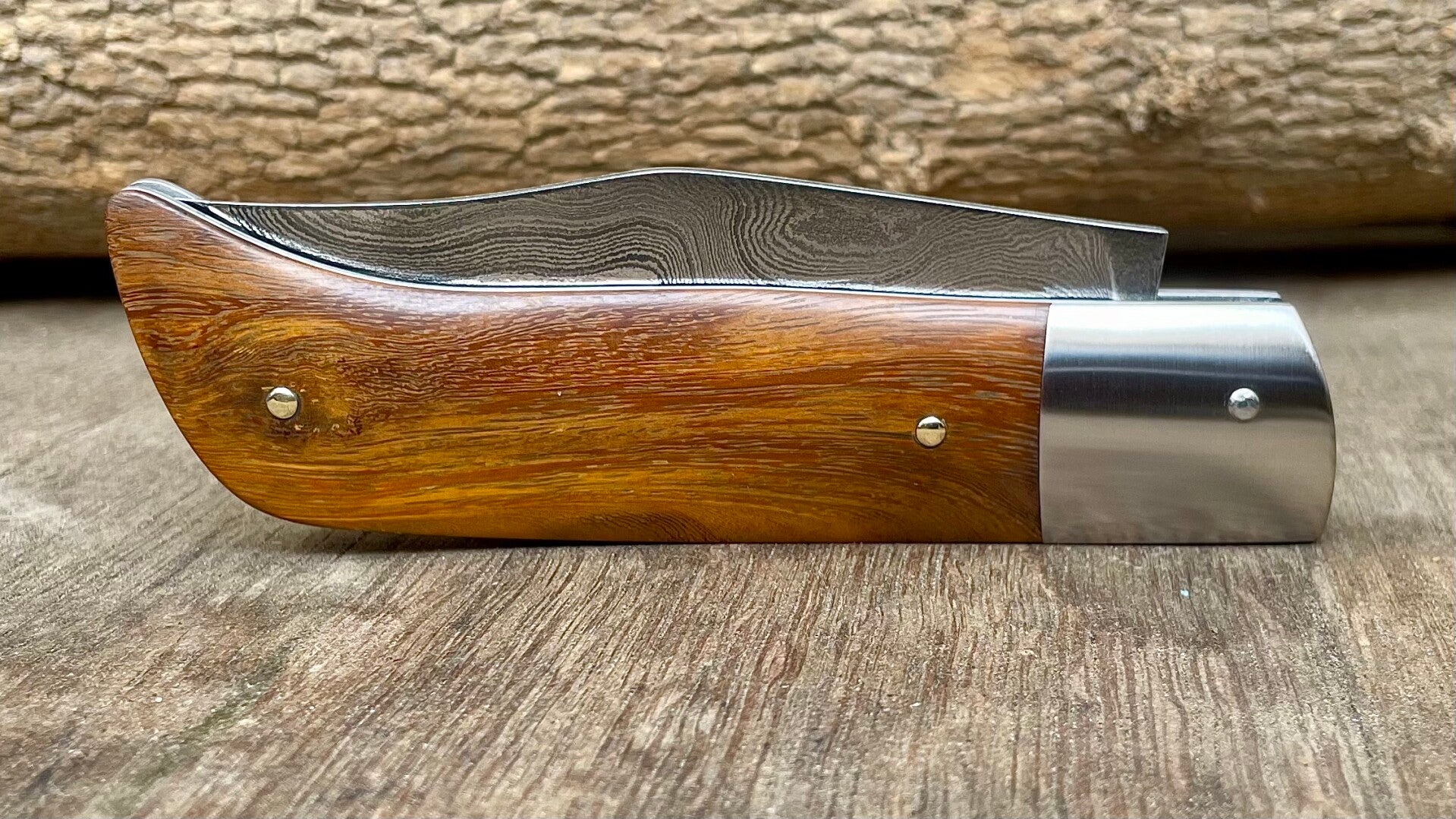 Couteau type Alpin à cran forcé avec stop pin, manche en madré cacao avec mitres en acier inoxydable trempées et brossées, lame an acier damas sandwich carbone d'Arnaud Gidel (Lames de l'Ouest).